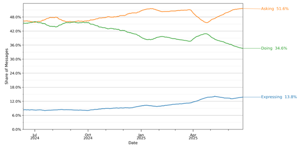 Image : graphique extrait de l’étude d’OpenAI montrant l’évolution des différentes catégories d’usages de ChatGPT dans le temps. L’usage pour l’écriture est peu à peu supplanté par la demande de conseil et la recherche d’information.   |
