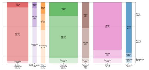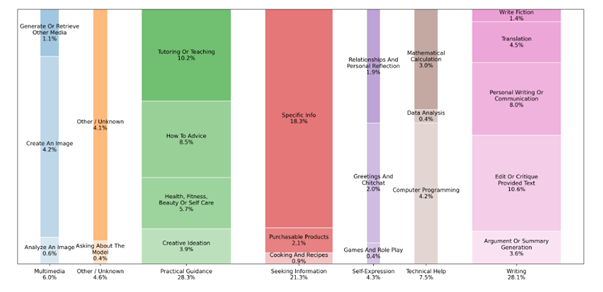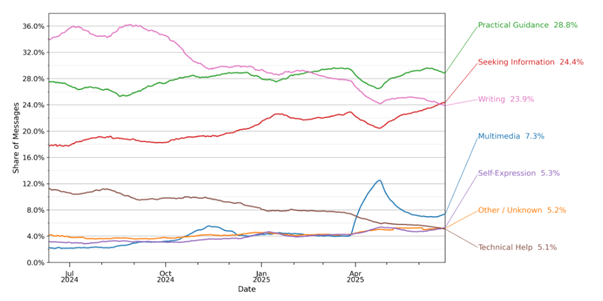 « Près de 80 % de l'utilisation de ChatGPT se répartit en trois grandes catégories : orientation pratique, recherche d'informations et rédaction ». « L'orientation pratique est le cas d'utilisation le plus courant et comprend des activités telles que le tutorat et l'enseignement, les conseils pratiques sur divers sujets et l'idéation créative. La recherche d'informations comprend la recherche d'informations sur des personnes, des événements d'actualité, des produits et des recettes, et semble être un substitut très proche à la recherche sur le Web. La rédaction comprend la production automatisée d'e-mails, de documents et d'autres communications, mais aussi la révision, la critique, la synthèse et la traduction de textes fournis par l'utilisateur. L'écriture reste l'usage le plus courant au travail, représentant en moyenne 40 % des messages professionnels en juin 2025. Environ deux tiers des messages écrits demandent à ChatGPT de modifier le texte de l'utilisateur (édition, critique, traduction, etc.) plutôt que de créer un texte de toutes pièces. Environ 10 % de tous les messages concernent des demandes de tutorat ou d'enseignement, ce qui suggère que l'éducation est un usage clé de ChatGPT ». Reste que les activités de production (écriture et reformulation, de recherche d’information et de conseils) demeurent bien supérieures à tout autre type d’usage. Les activités d’apprentissage actif semblent assez minoritaires dans les usages.