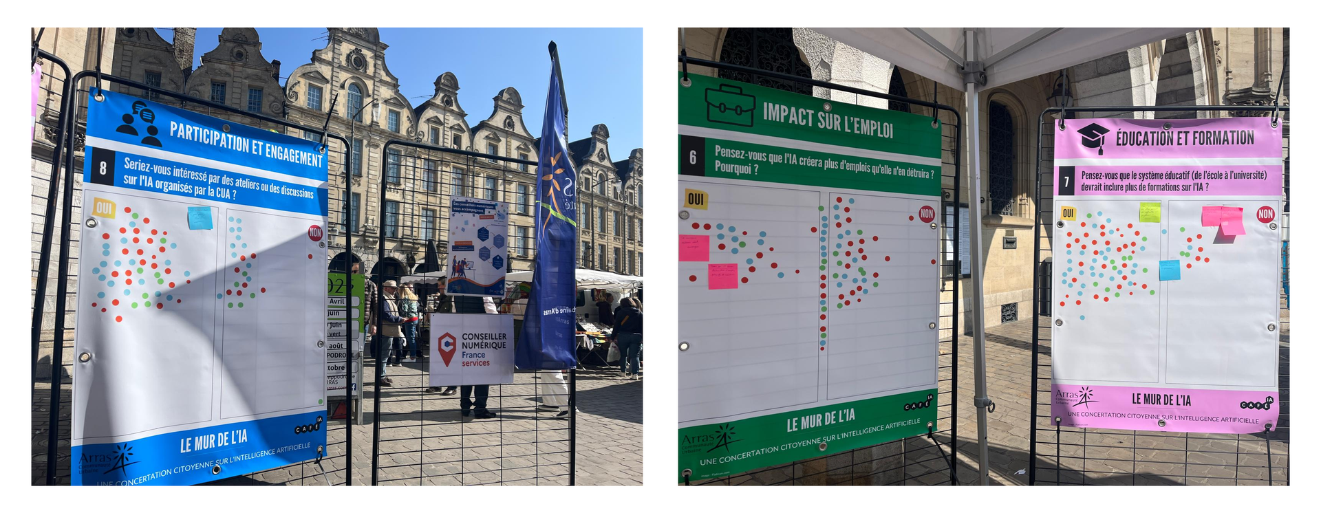 Enfin, d’un point de vue pratique, nous avons conçu des supports adaptés : des bâches résistantes pour l’extérieur (vent et pluie), mais aussi des formats papier A0 pour un usage intérieur. Le mur de l’IA a ainsi été déployé dans plusieurs contextes : au marché, lors d’une conférence des maires ou encore dans une journée dédiée aux jeunes. Ce format modulable permet de toucher différents publics, sans fragmenter l’analyse globale des résultats. »