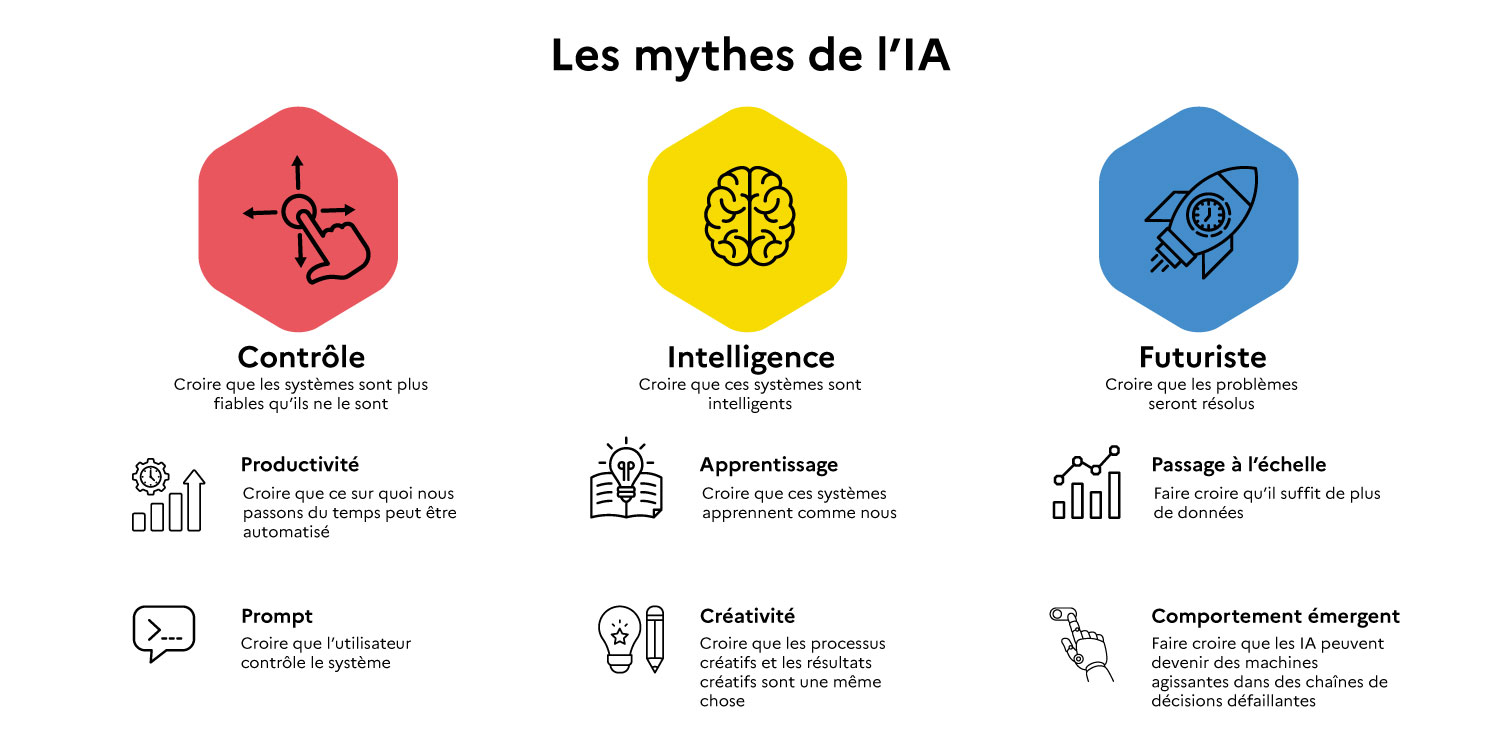 Un autre mythe du futur est le mythe du comportement émergent [6]. Mais qu’est-ce qui conduit à un comportement émergent ? « Est-ce la collecte de grandes quantités d’écrits qui conduit à une surperintelligence ? Ou est-ce plutôt la conséquence de la précipitation à intégrer divers systèmes d’IA dans des tâches de prise de décision pour lesquelles ils ne sont pas adaptés ? » Les risques de l’IA ne reposent pas sur le fait qu’elles deviennent des machines pensantes, mais peut-être bien plus sur le fait qu’elles deviennent des machines agissantes, dans des chaînes de décisions défaillantes.