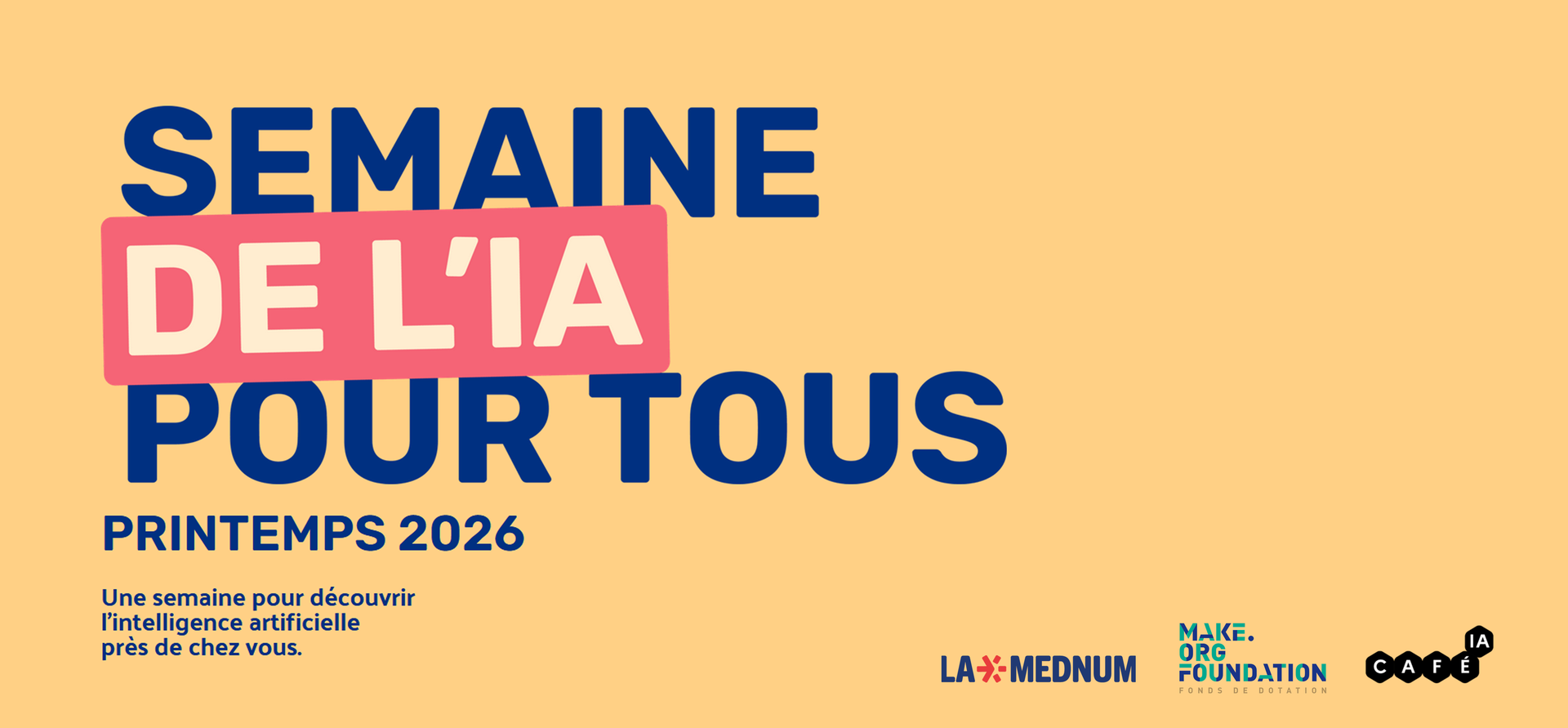 Nous sommes ravis de vous convier à nos 2 prochains webinaires de présentation de La Semaine de l’IA pour Tous, qui se tiendra du 18 au 24 mai 2026 dans toute la France, un événement mis en place avec la MEDNUM et Make.org.